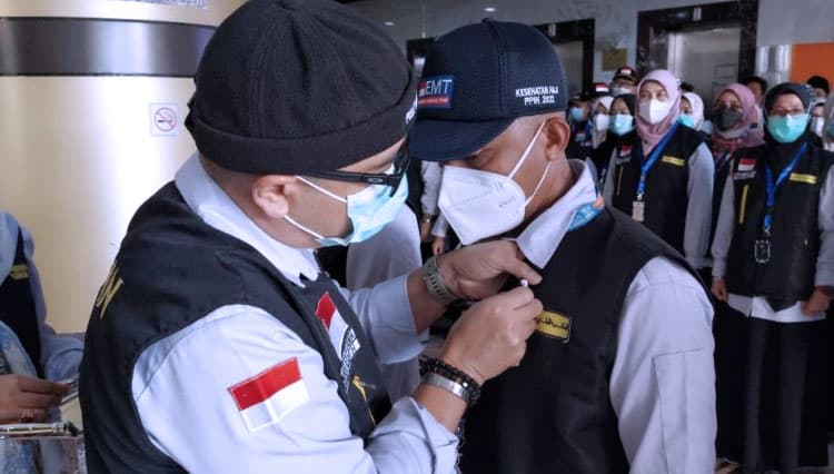 TIMES Lamongan/Kapuskes Haji Kemenkes Budi Sylvana saat menyematkan pin kepada petugas kesehatan haji. (FOTO: dok. Kemenkes)