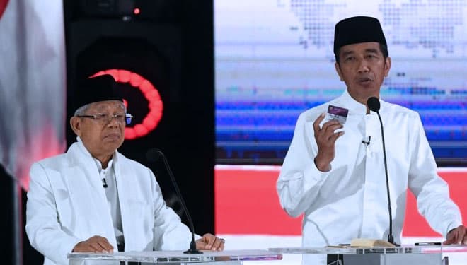 TIMES Lamongan/Pasangan capres-cawapres nomor urut 01 Joko Widodo (kiri) dan Ma'ruf Amin mengikuti debat kelima di Hotel Sultan, Jakarta, Sabtu (13/4/2019). (FOTO: Wahyu Putro A/Antarafoto)